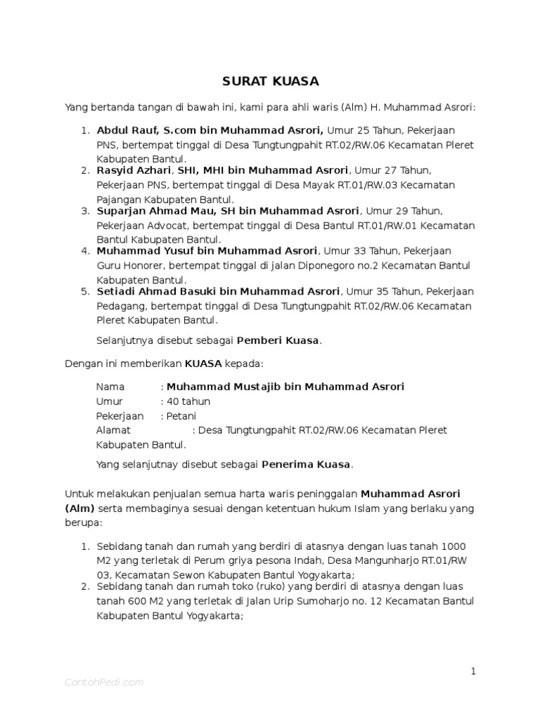 File draf surat kuasa ahli waris ini berisi pemberian kuasa dari para ahli waris untuk melakukan pembagian dan.
