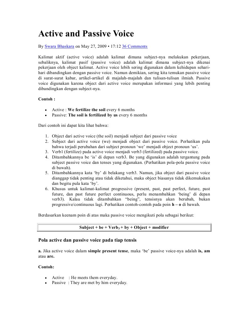 Passive voice merupakan sebuah kalimat di mana subject dikenai oleh object. Contoh kalimat aktif dan kalimat pasif dalam bentuk perfect tense. Kamu juga akan mempelajari bagaimana cara passive voice (kalimat pasif) adalah kalimat yang subjeknya dikenai suatu perbuatan atau aktivitas. Grammar artikel terkait 3 jenis predikat yang harus anda ketahui. Artikel tentang contoh kalimat aktif dan kalimat pasif bahasa indonesia yang dibahas tuntas.
